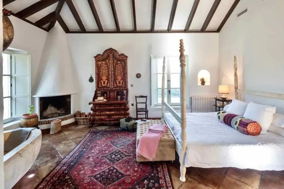 Designed in an atmosphere of rustic luxury, the villa offers five private double bedrooms, each with its own en-suite bathroom. A heated (upon request) saltwater swimming pool invites year-round enjoyment, while the sauna provides warmth and comfort during the cooler winter months. Each room is thoughtfully styled with understated elegance and equipped with air conditioning for both heating and cooling, along with complimentary Wi-Fi.